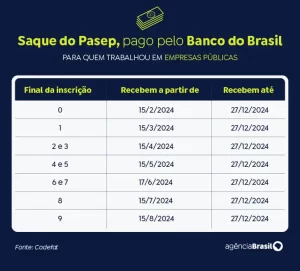 O PIS é pago pela Caixa Econômica Federal e o Pasep, pelo Banco do Brasil. Como ocorre tradicionalmente, os pagamentos serão divididos em seis lotes. O saque poderá ser feito desde o dia de liberação do lote até 27 de dezembro de 2024. Após esse prazo, será necessário aguardar convocação especial do Ministério do Trabalho e Previdência.