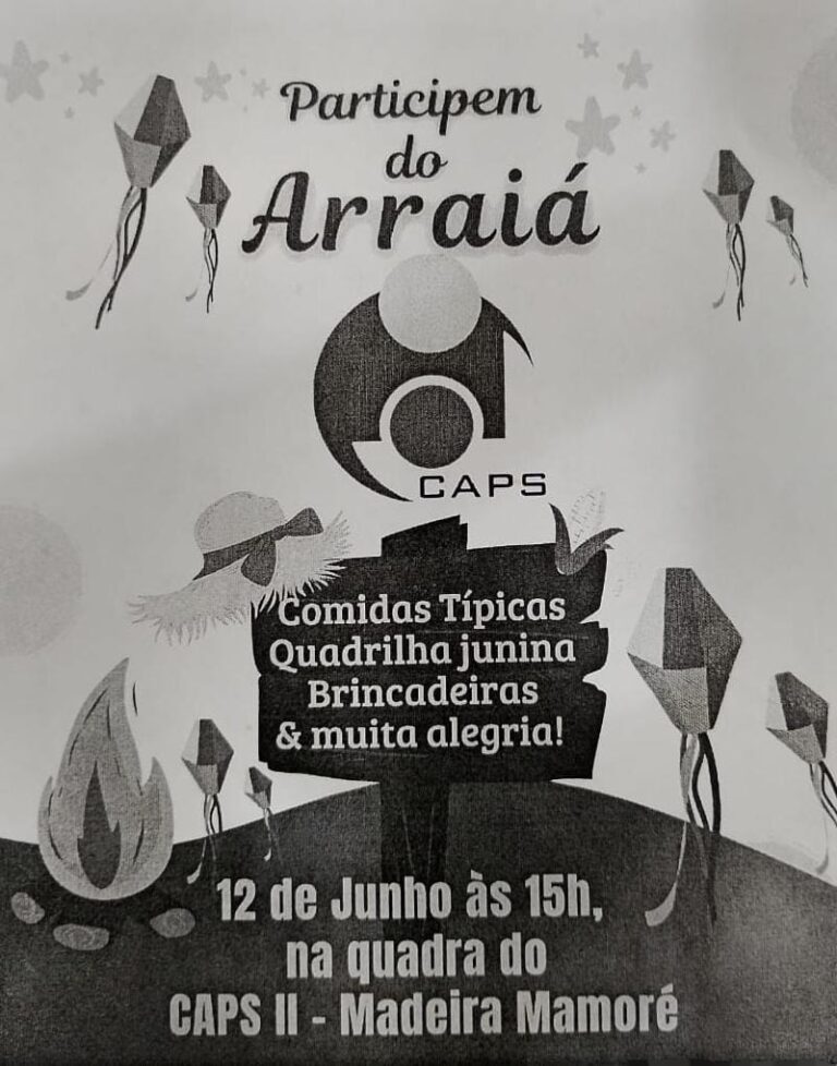 Participem do arraial do CAPS, no dia 12 dejunho às 15 horas na quadra do CAPS II – Madeira Mamoré, e terá comidas típicas, quadrilha junina, brincadeiras e muita alegria.