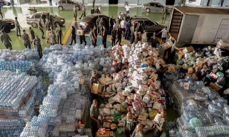 Após percorrer todo o trajeto, os carros, enfileirados, são recepcionados por dezenas de militares da FAB, responsáveis por retirar as doações dos veículos e fazer a fila andar com agilidade. Em seguida, eles se perfilam para levar, de braço em braço, os itens que já são triados e ficam agrupados por setores. Em 1h30, a reportagem da Agência Brasil pode conferir o crescimento dos fardos de água potável e das pilhas de roupas novas e usadas, alimentos não perecíveis, ração para animais, entre outros, em um dos três hangares da FAB destinados às doações.