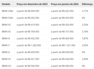 Desta forma, o carro que está mais caro é o elétrico BMW i4. Por outro lado, BMW 530e, BMW iX e BMW iX3 seguem sendo vendidos pelos mesmos preços de dezembro de 2023. Veja abaixo: