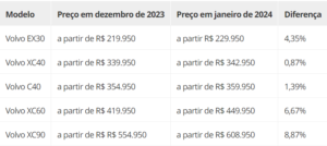 Desta forma, a ideia da Volvo era que o EX30, que chega só este ano, tivesse um repasse menor de imposto que o de XC40 e C40. A Volvo estipulou um aumento de 5% para o inédito SUV de entrada e de 10% para seus outros elétricos, assim como para os veículos híbridos plug-in, caso de XC60 e XC90. No entanto, até o momento, os aumentos não seguiram essas regras e foram menores. Veja abaixo: