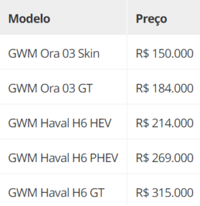 A Great Wall Motors (GWM) anunciou que vai manter o preço da versão de entrada do GWM Ora 03 até o final de janeiro ou enquanto durarem os estoques. Portanto, quem estiver interessado em comprar a configuração Skin vai poder pagar R$ 150 mil. Mas com algumas condições: entrada de 50%, 24 parcelas fixas e taxa zero.A fabricante chinesa também informa que vai manter os preços de seus outros modelos. Nestes casos, a GWM deixa claro que não há previsão de aumento e que os preços podem subir a partir de uma “observação da marca sobre o mercado e outros fatores externos”.
