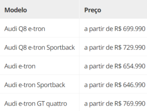 A Audi é mais uma que optou por manter os preços de seus carros mesmo com a volta do imposto. Portanto, todos os modelos elétricos da marca alemã continuam sendo vendidos pelos mesmos valores oferecidos em dezembro de 2023. Além disso, não há previsão de aumento. Veja abaixo: