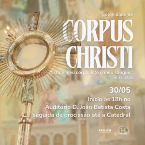 Nesta quinta-feira (30) acontece a celebração de Corpus Christi, data importante para os fiéis católicos. Em Porto Velho haverá uma solenidade com início às 18h no Auditório D. João Batista Costa e em seguida uma procissão que seguirá até a Catedral Sagrado Coração de Jesus, localizada na rua Dom Pedro II, bairro Caiari, região central da Capital.