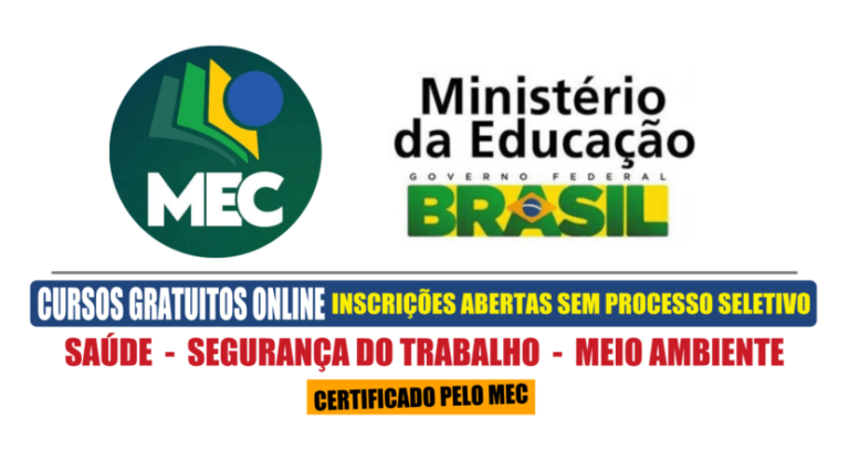 MEC está oferecendo cursos gratuitos e online (EAD) com certificados área da Saúde, Segurança do Trabalho e Meio Ambiente. Não é necessário