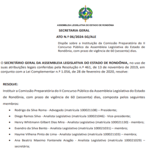 Nesta segunda-feira, 29 de abril, foi publicado o ato que instituiu a comissão responsável pelo novo concurso ALE RO (Assembleia Legislativa do Estado de Rondônia).