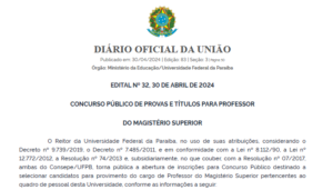 A Universidade Federal da Paraíba (UFPB) acabou de divulgar um novo edital para um concurso público com objetivo de prover vagas para o cargo de professor do magistério superior.