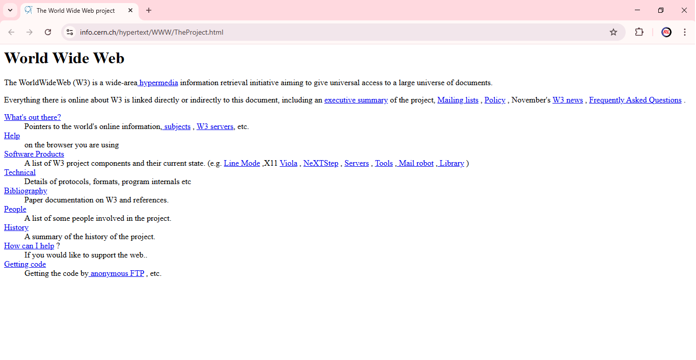 A página, que permanece no ar até hoje como um documento histórico da criação da world wide web, era extremamente simples e contava apenas com um texto em HTML básico, ou seja, sem imagens ou recursos interativos e dinâmicos típicos dos websites atuais.