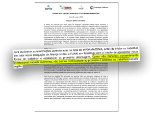 Mas, no início de novembro, após a InfoAmazonia ser informada sobre a continuidade das reuniões para a assinatura dos contratos nas terras indígenas no Alto Solimões, os empresários mudaram a versão sobre a participação da Funai. Em resposta direta à reportagem, o grupo CommunityRedd+ afirmou que o projeto foi desenvolvido com a participação do órgão indigenista brasileiro: “há atas, listas de presença e vídeos que mostram a presença da Funai no processo”, afirmaram.