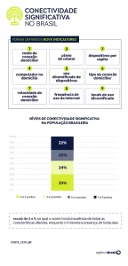 Apenas 22% dos brasileiros com mais de 10 anos de idade têm condições satisfatórias de conectividade, apesar de o acesso à internet estar perto da universalização no país. Outros 33% da população estão no nível mais baixo do índice que mede a conectividade significativa no país (de 0 a 2 pontos) e 24% ocupam a faixa de 3 a 4 pontos.