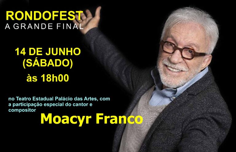 Fenômeno da televisão brasileira, o cantor, compositor e comediante Moacyr Franco vem a Porto Velho neste sábado, 14 de junho, para uma participação especial no espetáculo de encerramento do Festival Rondônia de Música, o Rondofest. O evento se realizará no teatro estadual Palácio das Artes e terá início às 18h00.