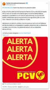 O PVC (Partido Comunista da Venezuela) publicou nesta 3ª feira (30.jul.2024) uma nota contrária à autoproclamada vitória de Nicolás Maduro (Partido Socialista Unido da Venezuela, esquerda) na eleição à Presidência. Segundo o partido, o anúncio do resultado “contrasta abertamente com o ânimo que existiu durante o processo eleitoral”. O partido também pediu que as forças “genuínamente democráricas” que unam forças para “defender a vontade do povo venezuelano”. A sigla pediu ainda que o CNE (Conselho Nacional Eleitoral) divulgue todos os boletins de urna do pleito de domingo (28.jul).Leia a íntegra do comunicado (PDF – 179 kB, em espanhol).