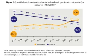 O número de professores concursados passou de 505 mil em 2013, o que representava 68,4% do total de docentes nas redes estaduais, para 321 mil em 2023, ou 46,5% do total. Já os contratos temporários superaram os efetivos em 2022 e, em 2023 chegaram aos 356 mil, representando 51,6% do total de contratações. Em 2013, eram 230 mil, o equivalente a 31,1% do total.