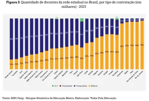 A proporção de docentes temporários e efetivos varia de acordo com a unidade federativa do país. No ano passado, 15 dessas unidades tinham mais professores temporários que efetivos e, ao longo da década, 16 aumentaram o número de professores temporários e diminuíram o quadro de concursados.