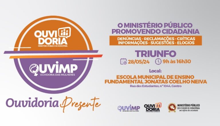 Buscando intensificar o diálogo com a sociedade, o Ministério Público de Rondônia (MPRO) anuncia a realização do projeto “Ouvidoria Presente” no Distrito de Triunfo, pertencente ao município de Candeias do Jamari, na próxima terça-feira (28/5), na escola Jonatas Coelho Neiva, com início dos atendimentos às 9h, e conclusão às 16h30.
