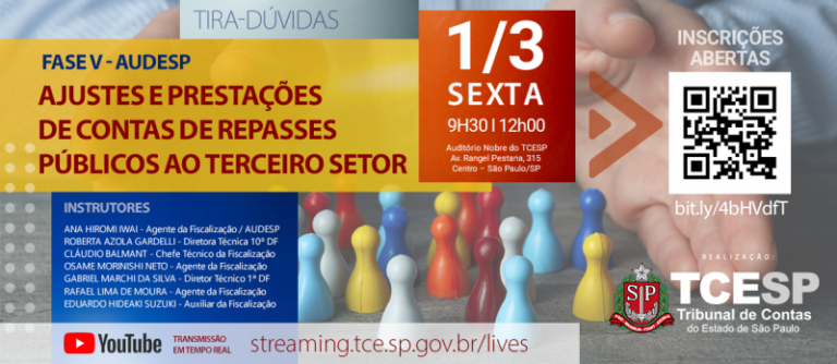 O Tribunal de Contas do Estado de São Paulo (TCESP) realiza, na sexta-feira (1/3), das 9h30 às 12h00, na Capital, capacitação, no formato tira-dúvidas, para esclarecer os ajustes e prestação de contas dos recursos públicos utilizados pelo Terceiro Setor, previstos na Fase V do Sistema de Auditoria Eletrônica do Estado de São Paulo (Audesp).